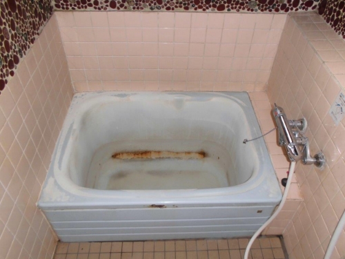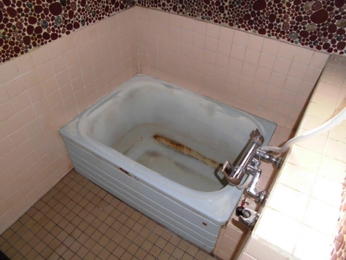 鋳物ホーロー浴槽にサビが浮き、穴が開きそうなので浴槽を取り換えたい…、とご依頼頂き現地調査にお伺いすると、入り口ドア及び浴室窓の「間口」が浴槽より小さい事が判明。