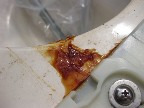 撤去後、ウォシュレットを分解し、原因追究してみたところ、これはウォシュレット本体内の基盤が溶け出したもののようでした。