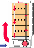熱の流れ【エルサーマット�・】 [レンガに穴が開いている場合] が通ることで蓄えられた熱をムダなく取り出すことが可能になりました。さらにクロスフローファンにより機器本体の表面の輻射を増幅させるように、上部に向かって放熱されます。