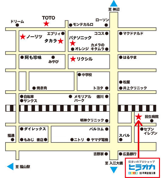 (株)平岡設備工業 広島県福山市引野町5-10-33 電話(084)941-1010 定休日:第2・4土曜日/日曜日/夏期・年末年始 営業時間 10:00〜17:00 ※イベントの為、臨時休業する場合が年に数回ございます。ご来店の前にお電話でご確認ください。