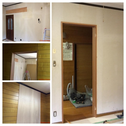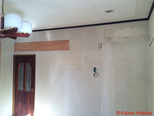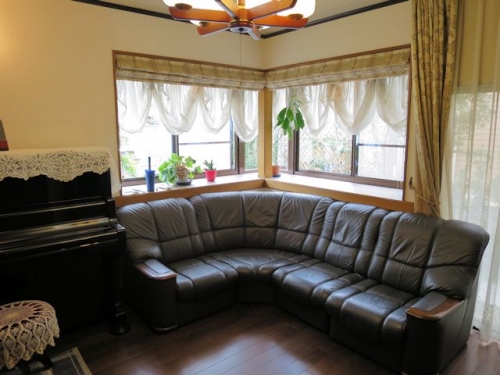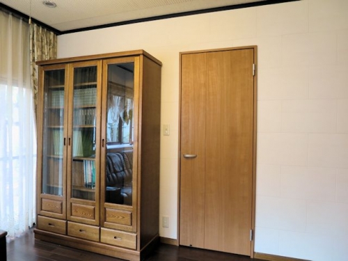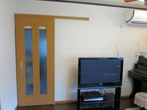リビングのエアコンドレン漏水に伴い床カーペットからフローリング、壁はビニールクロスの貼り替えのご要望でした。ご提案としてテレビ・ピアノ・書棚部分の壁面をエコカラット貼り、出窓部分の天板貼り替えと窓を複層ガラスに取替え床はガス温水床暖房と入口ドアとキッチンドアを引き戸に取替え